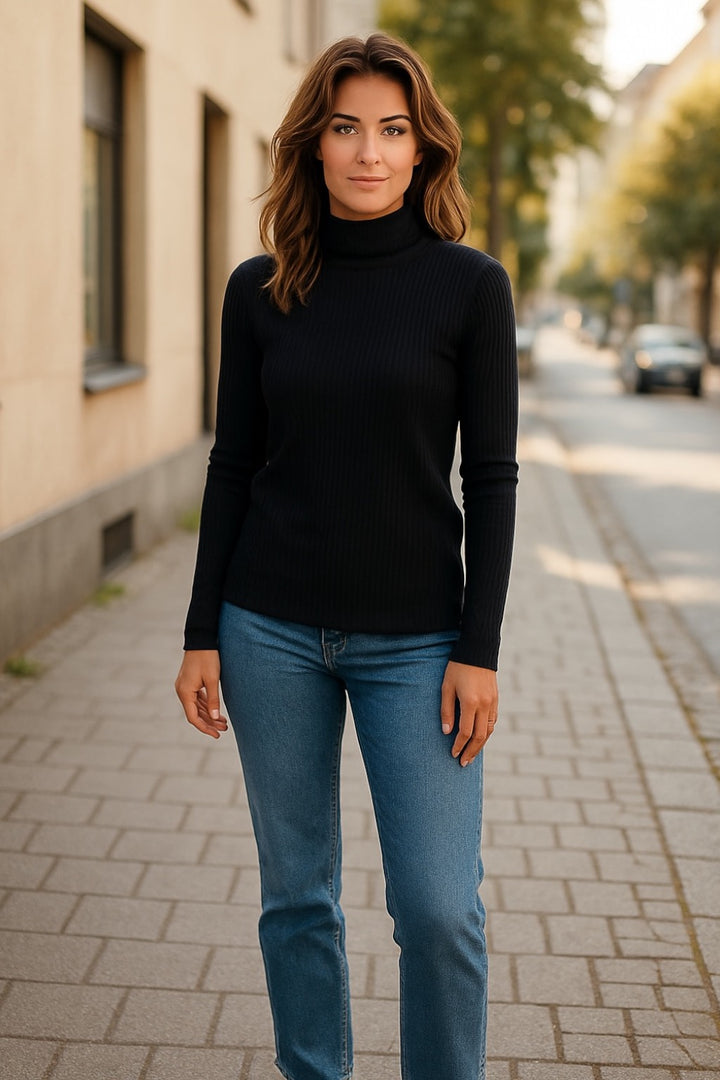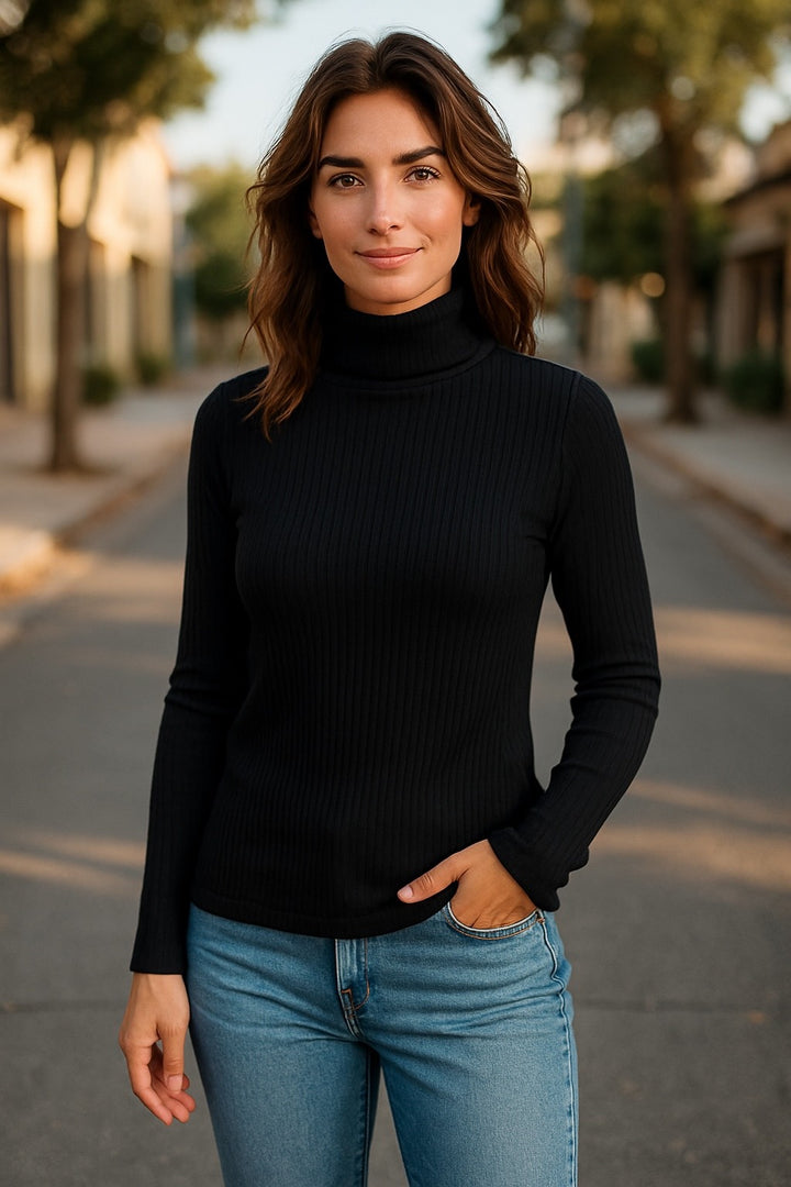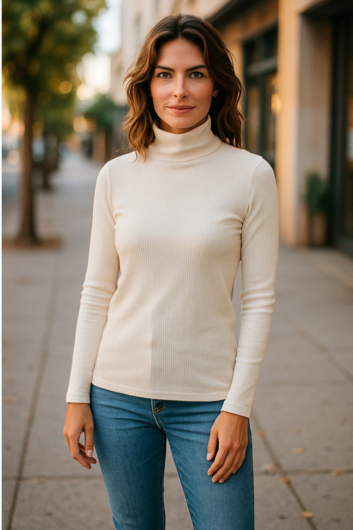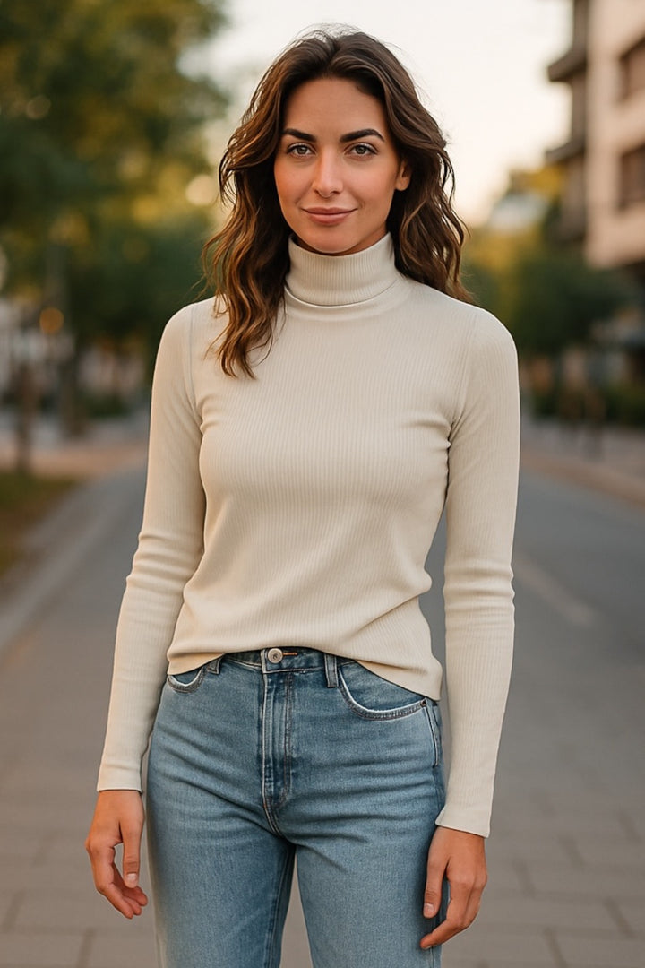 Combine elegância e versatilidade com a nossa Camiseta manga longa com gola alta em malha canelada Punta Cana.