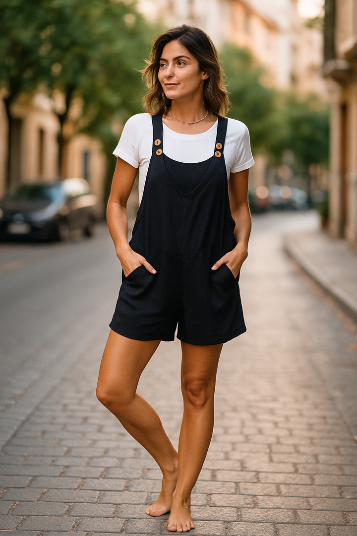 Pensado nos detalhes, possui alças ajustáveis com charmosos botões de coco, permitindo que você encontre o caimento ideal. Além disso, conta com bolsos frontais e traseiros práticos para o seu dia a dia.