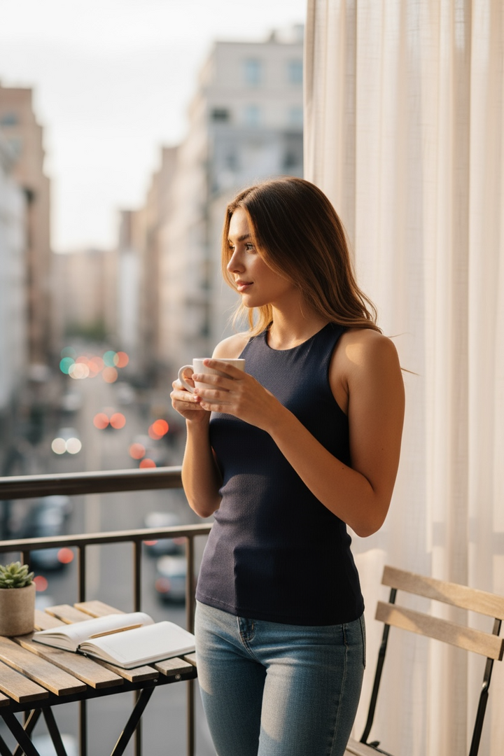 Combine elegância e versatilidade com a nossa Regata canelada. Perfeita para compor looks praianos e urbanos.