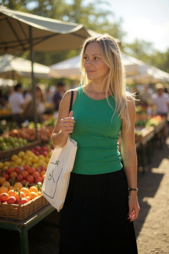 - Combine a Regata Ombro Só com uma saia três marias e sandálias rasteiras para um look casual e praiano.