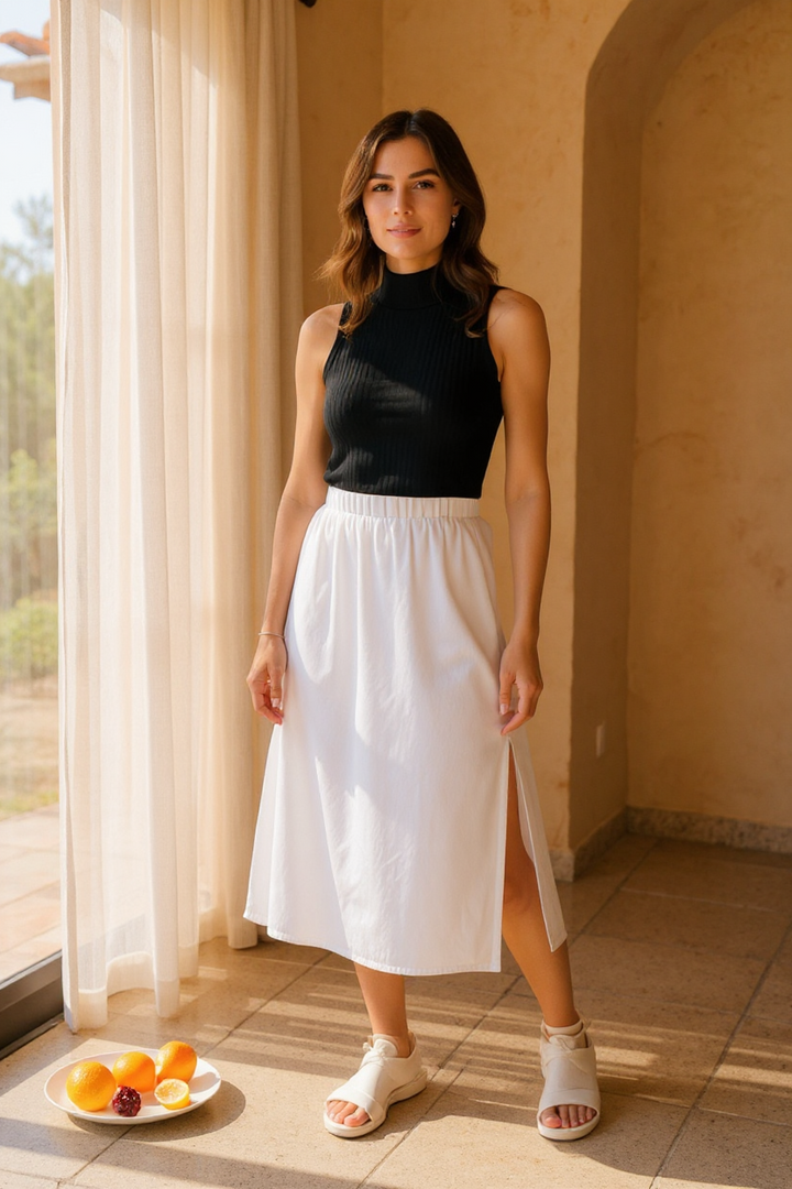 Liberdade e fluidez para o seu dia a dia! Apresentamos a nossa Saia Midi em Viscolycra, a peça essencial que une o conforto incomparável de um tecido leve e macio com um toque de elegância moderna.