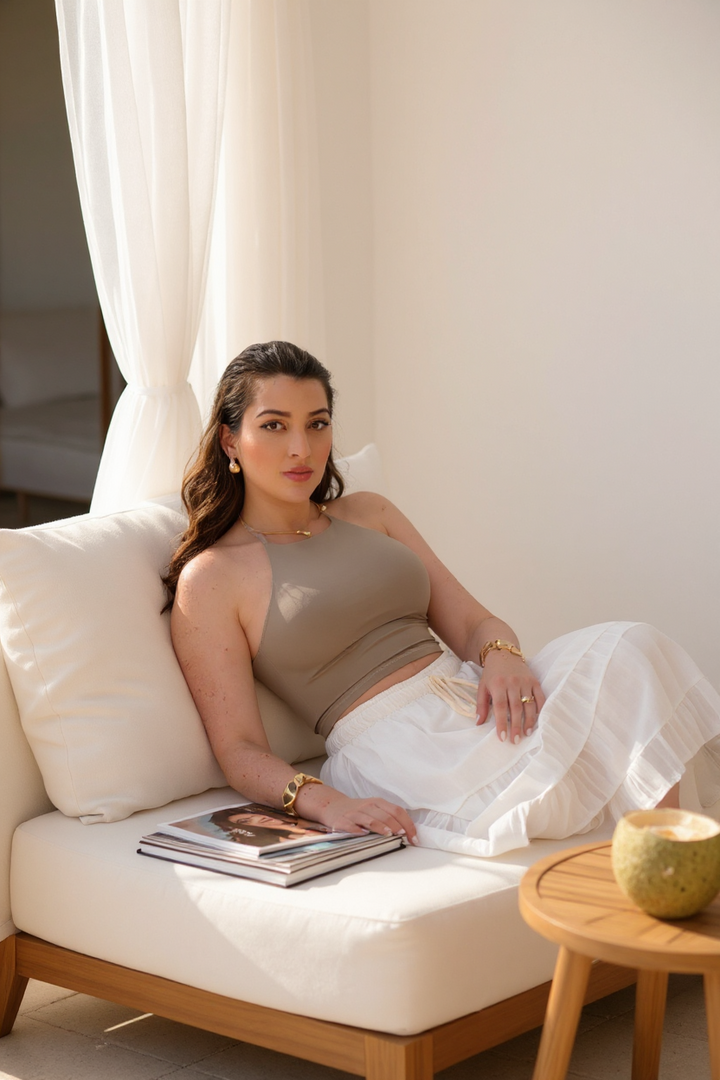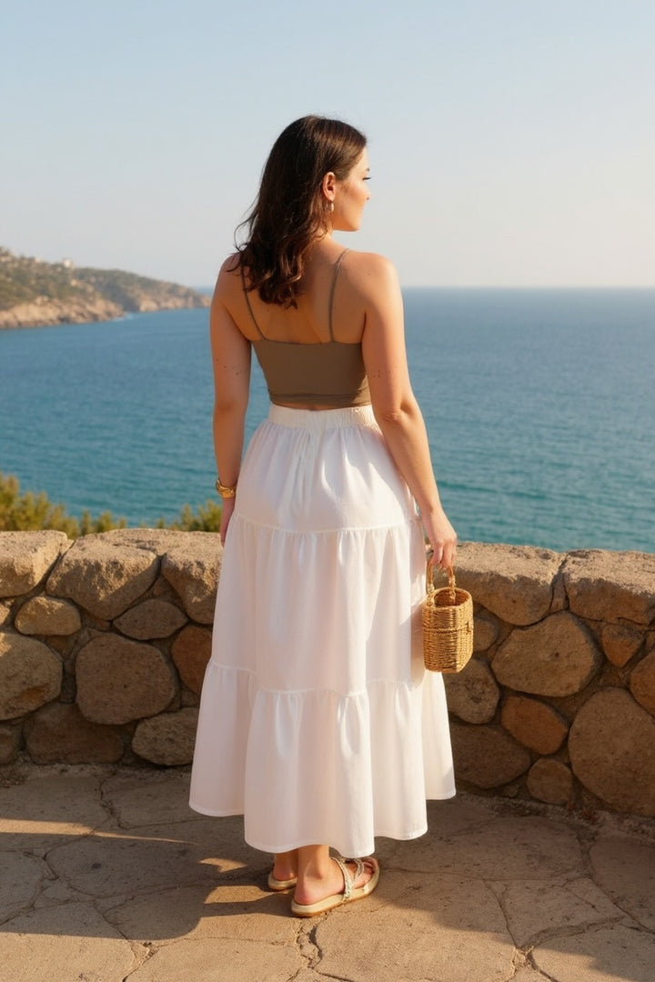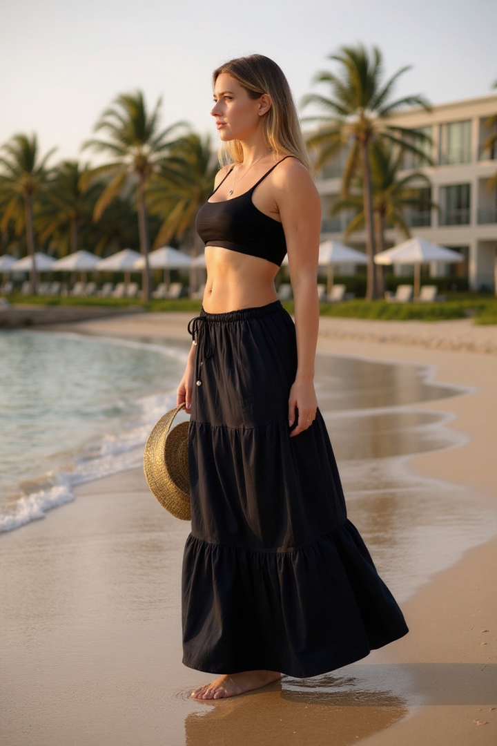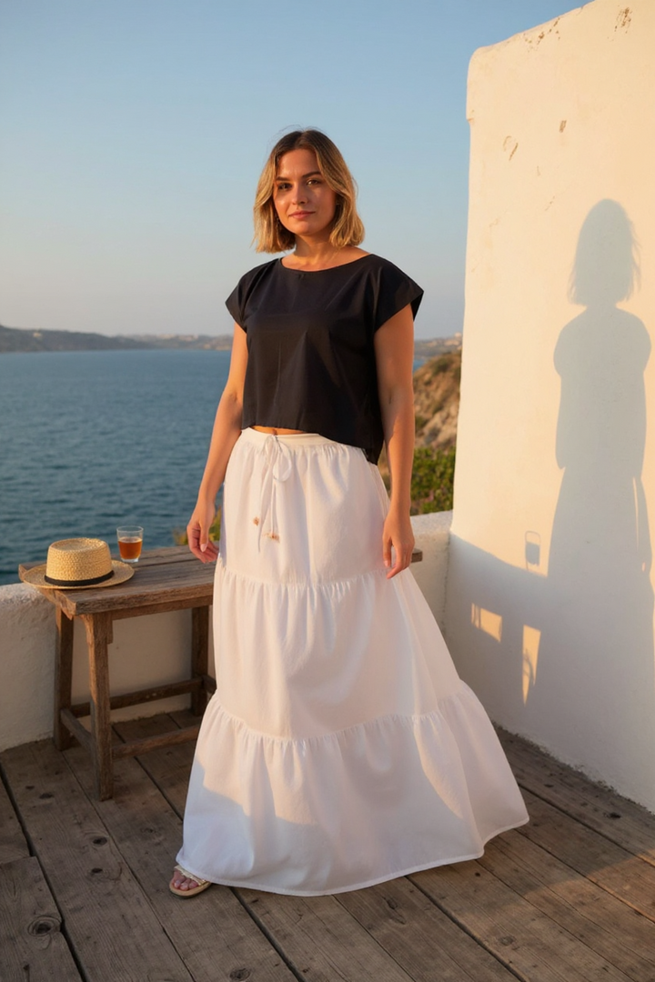 Saia camadas longa com elástico na cintura e cordão em algodão com ponteira de madeira para melhor ajuste.