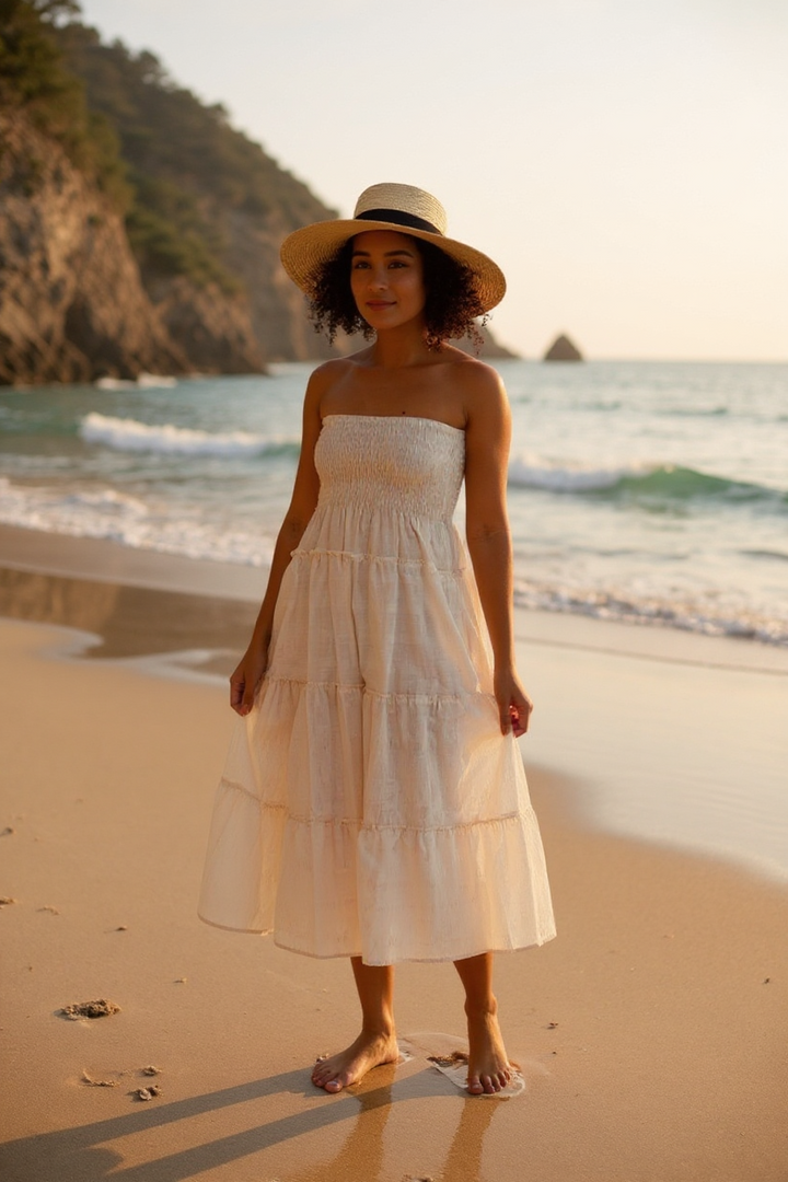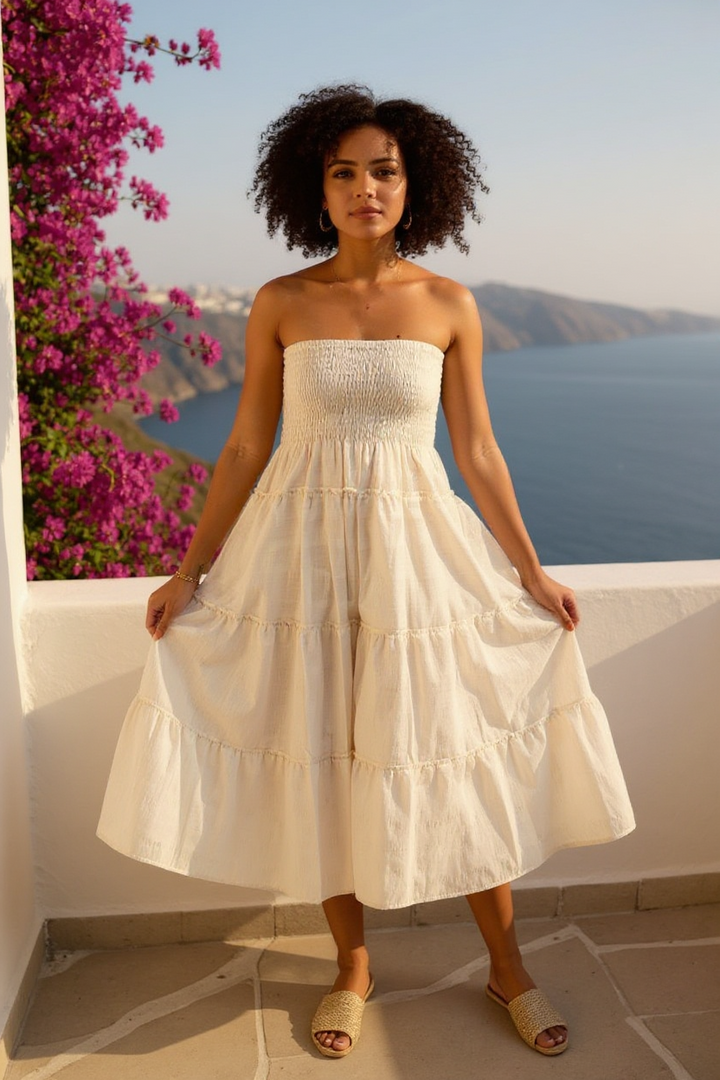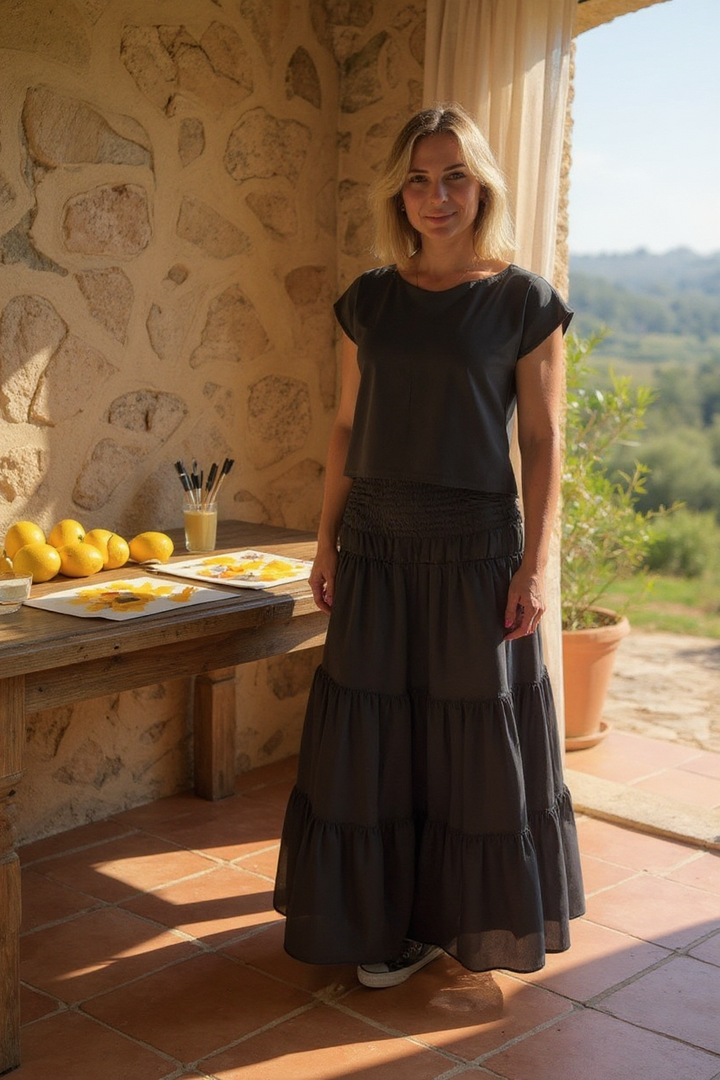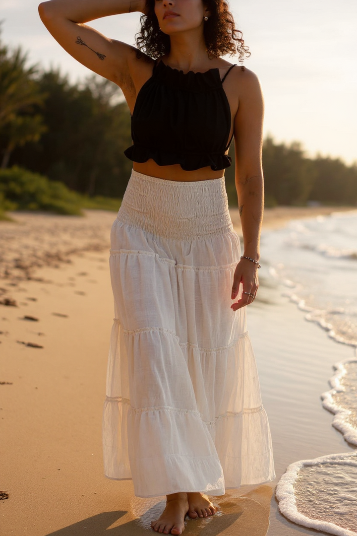 A Saia camadas longa com lastex na cintura é uma ótima pedida para o verão, pode ser usada como vestido tomara que caia.