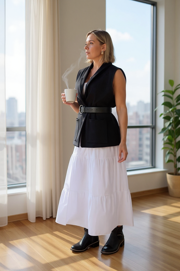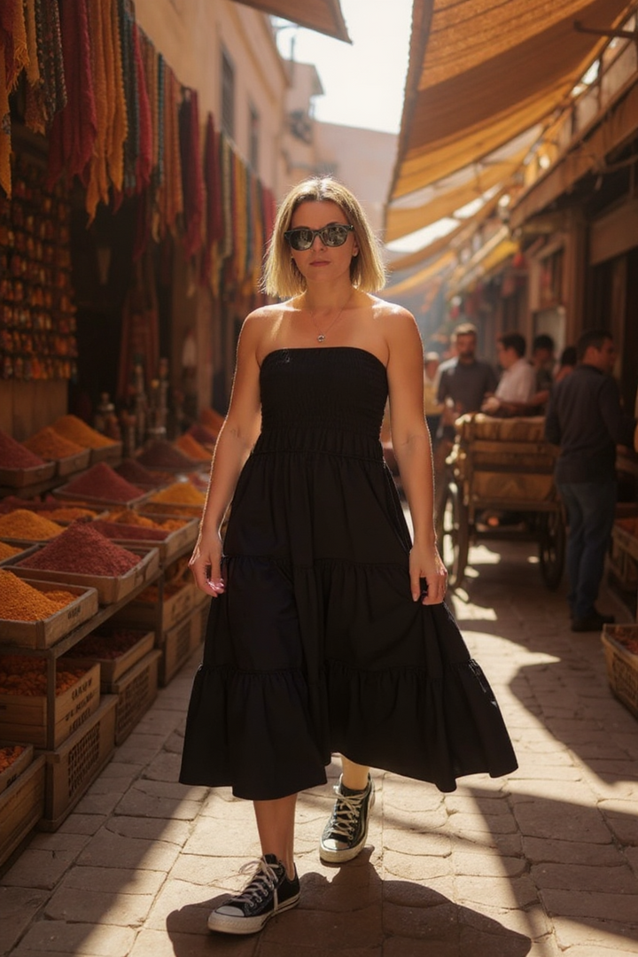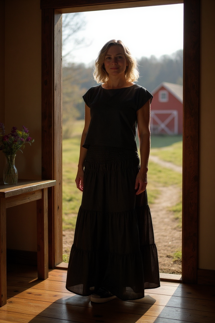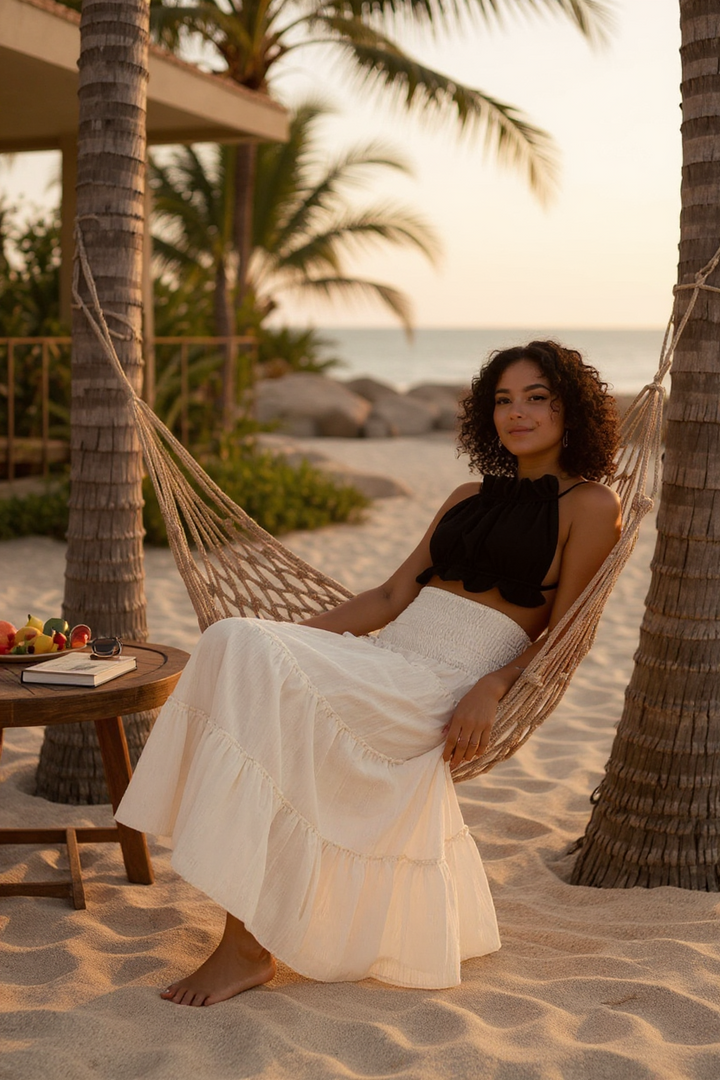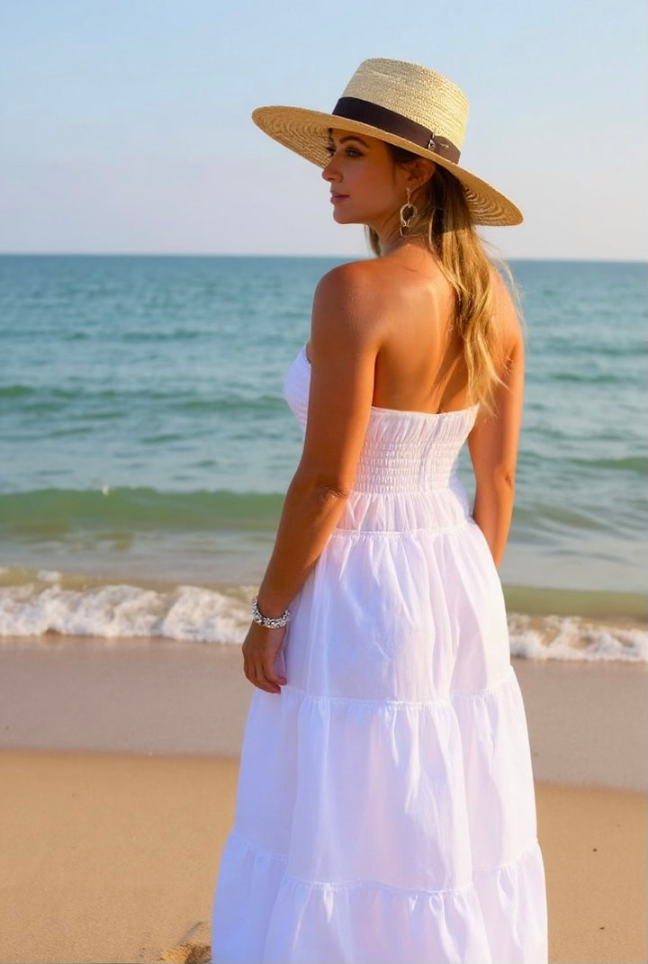 A Saia camadas longa com lastex na cintura é uma ótima pedida para o verão, pode ser usada como vestido tomara que caia.