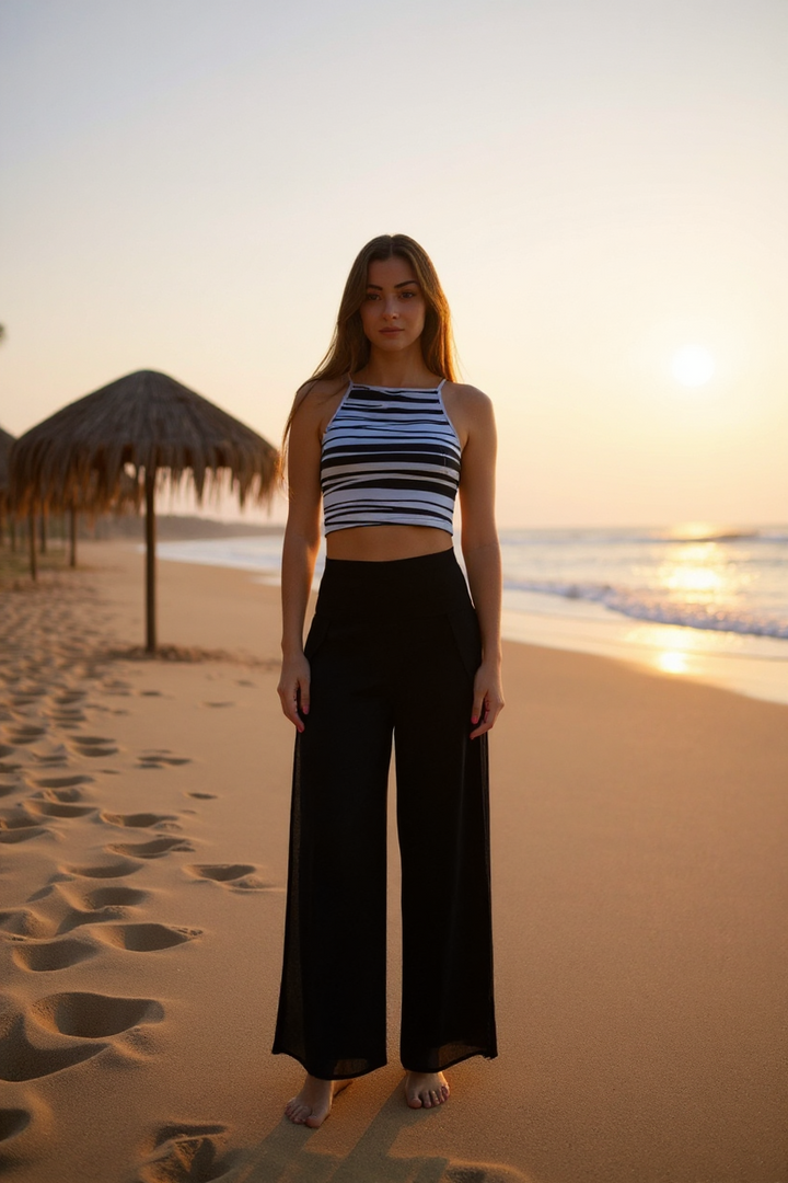 - Cidade: Use o top com calças de linho de cintura alta ou saias midi plissadas. Adicione uma jaqueta de sarja leve ou um blazer aberto para um toque moderno. Finalize com sandálias plataforma ou tênis brancos para um look elegante e confortável.