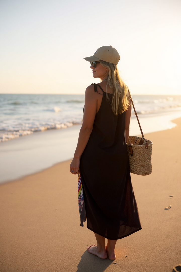 Sinta a fluidez elegante do seu comprimento midi e a praticidade do ajuste perfeito no ombro com amarração em rolotê, permitindo que você personalize o seu look com um toque de charme único. As fendas laterais estratégicas adicionam um toque de sensualidade sutil e garantem liberdade total de movimento, para que você possa aproveitar cada momento com leveza e estilo.