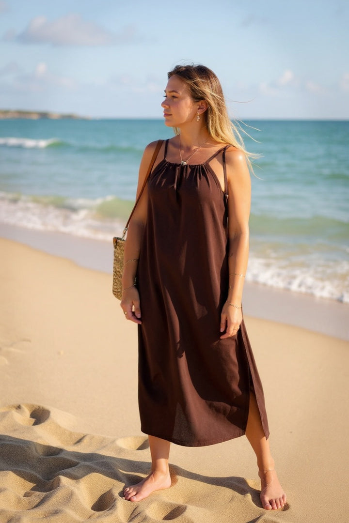 Deseje a liberdade e a sofisticação que só o Vestido Midi La Digue pode te proporcionar! Confeccionado no toque fresco e inigualável do tecido Fluity, este vestido é como uma brisa suave em sua pele, oferecendo um conforto excepcional para os seus dias de sol e além.
